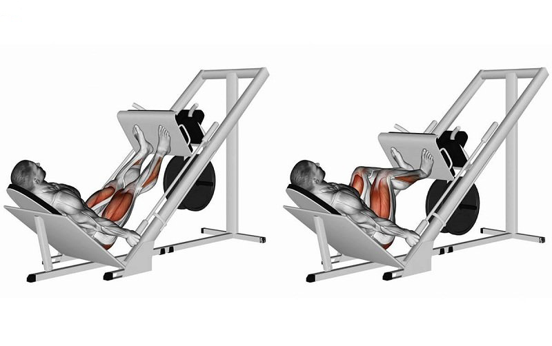 В зависимости от того, куда мы хотим направить нагрузку, стопы на платформе выставляются по-разному. Например, чем ниже мы ставим стопы, тем сильнее нагружается квадрицепс. Если ноги ставим вместе, то нагружается его внешняя часть, если широко – внутренняя. Если ноги стоят по центру платформы, то нагрузка распределяется равномерно между бицепсом и квадрицепсом бедра (т. е. нижней и верхней его поверхностями). А если ставить ноги высоко, то больше работают задняя поверхность бедра и ягодицы
